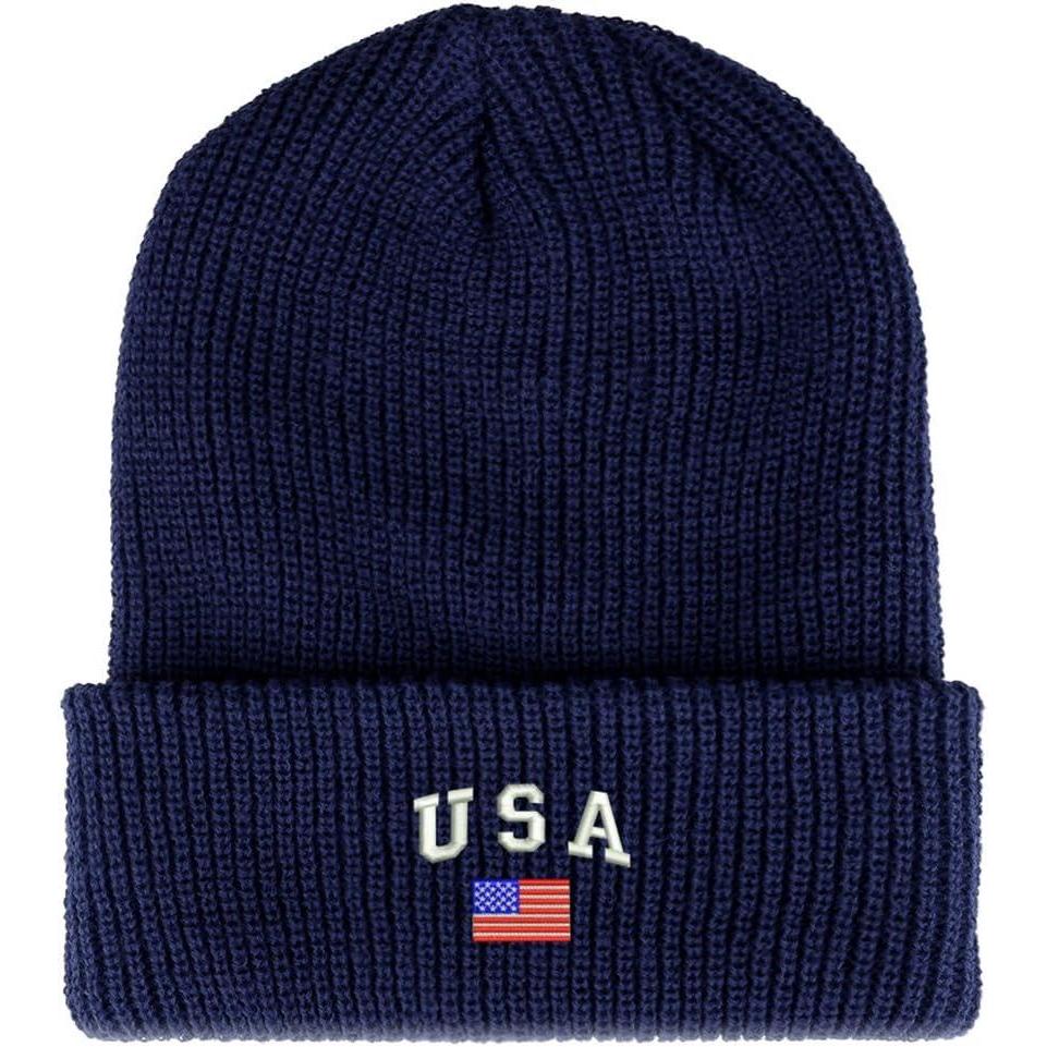 Trendy Apparel Shop American Flag and USA Embroidered Ribbed Cuffed Knit Beanie(Navy)