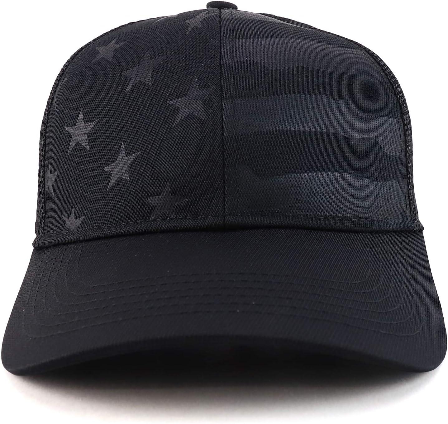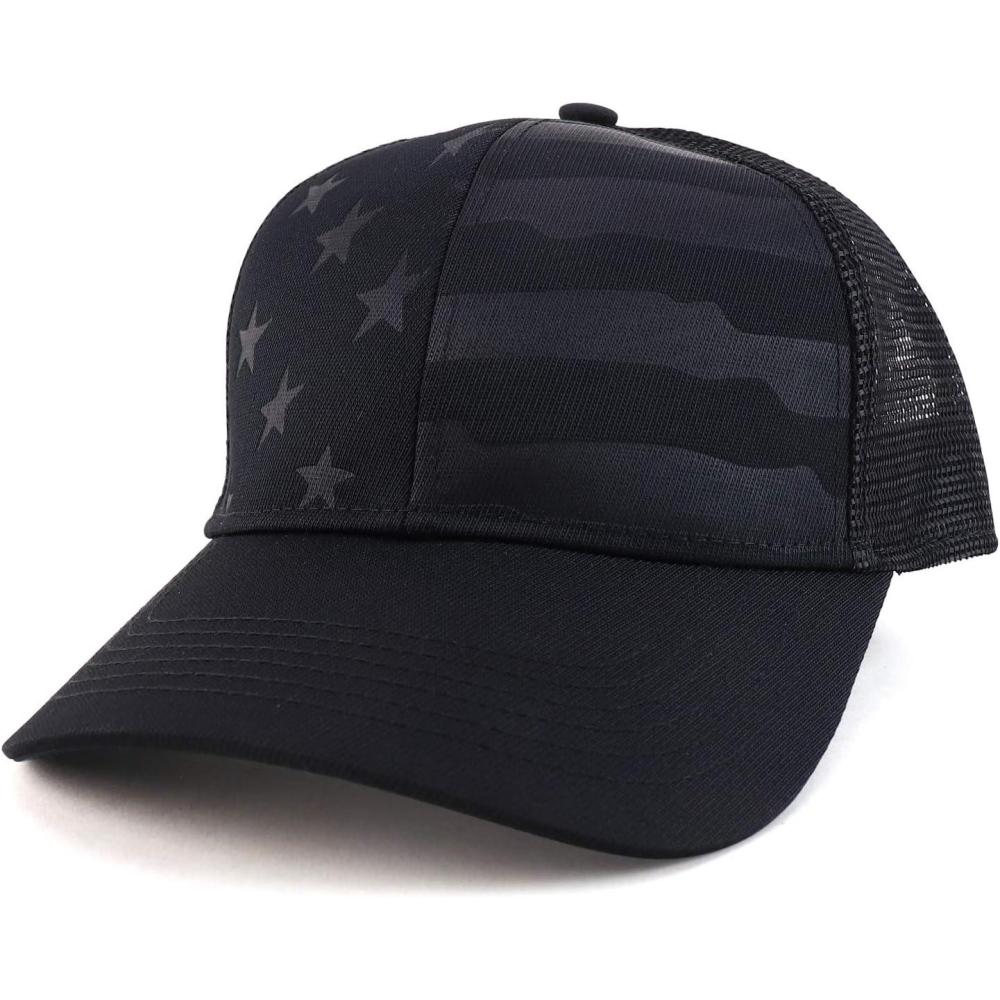 Trendy Apparel Shop Debossed Stars and Striped Trucker Mesh Back Baseball Cap. Polyester/spandex blend; Nylon mesh back. **IMPORTED : Hand wash available. ADJUSTABLE PLASTIC SNAP CLOSURE : One Size Fits Most, Comfortable Everyday Fit. DEBOSSED STARS AND STRIPES : Proud of US – Represent your loyalty, duty, respect, honor, pride. STYLE YOUR WAY : Best cloth decorations for men women on fourth of July and every day!. CIRCUMFERENCE: 56-60cm; Brim: 2.7 inches; Crown: 3 inches.