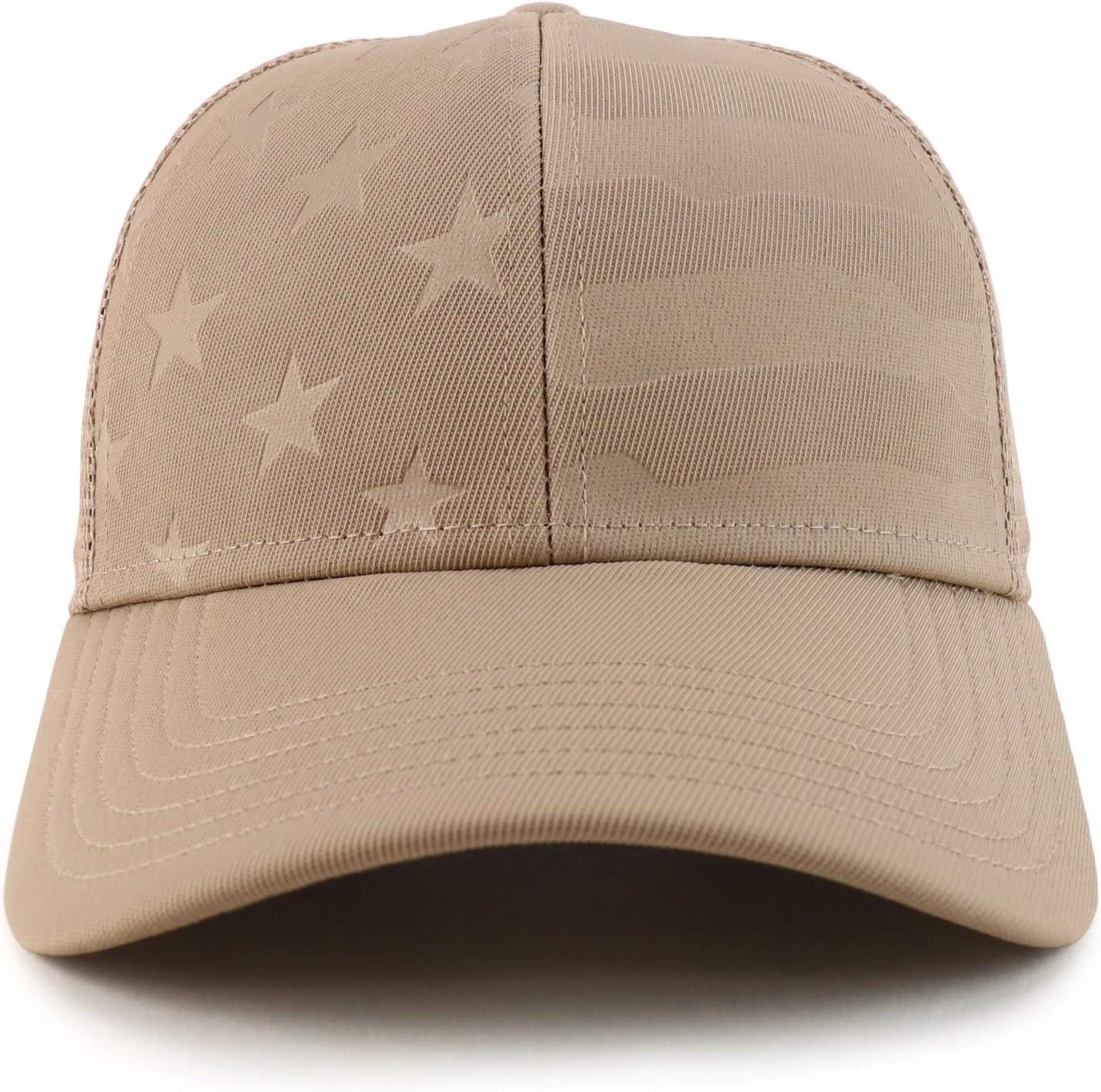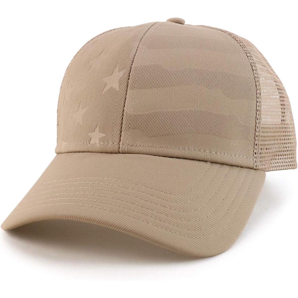 Trendy Apparel Shop Debossed Stars and Striped Trucker Mesh Back Baseball Cap. Polyester/spandex blend; Nylon mesh back. **IMPORTED : Hand wash available. ADJUSTABLE PLASTIC SNAP CLOSURE : One Size Fits Most, Comfortable Everyday Fit. DEBOSSED STARS AND STRIPES : Proud of US – Represent your loyalty, duty, respect, honor, pride. STYLE YOUR WAY : Best cloth decorations for men women on fourth of July and every day!. CIRCUMFERENCE: 56-60cm; Brim: 2.7 inches; Crown: 3 inches.