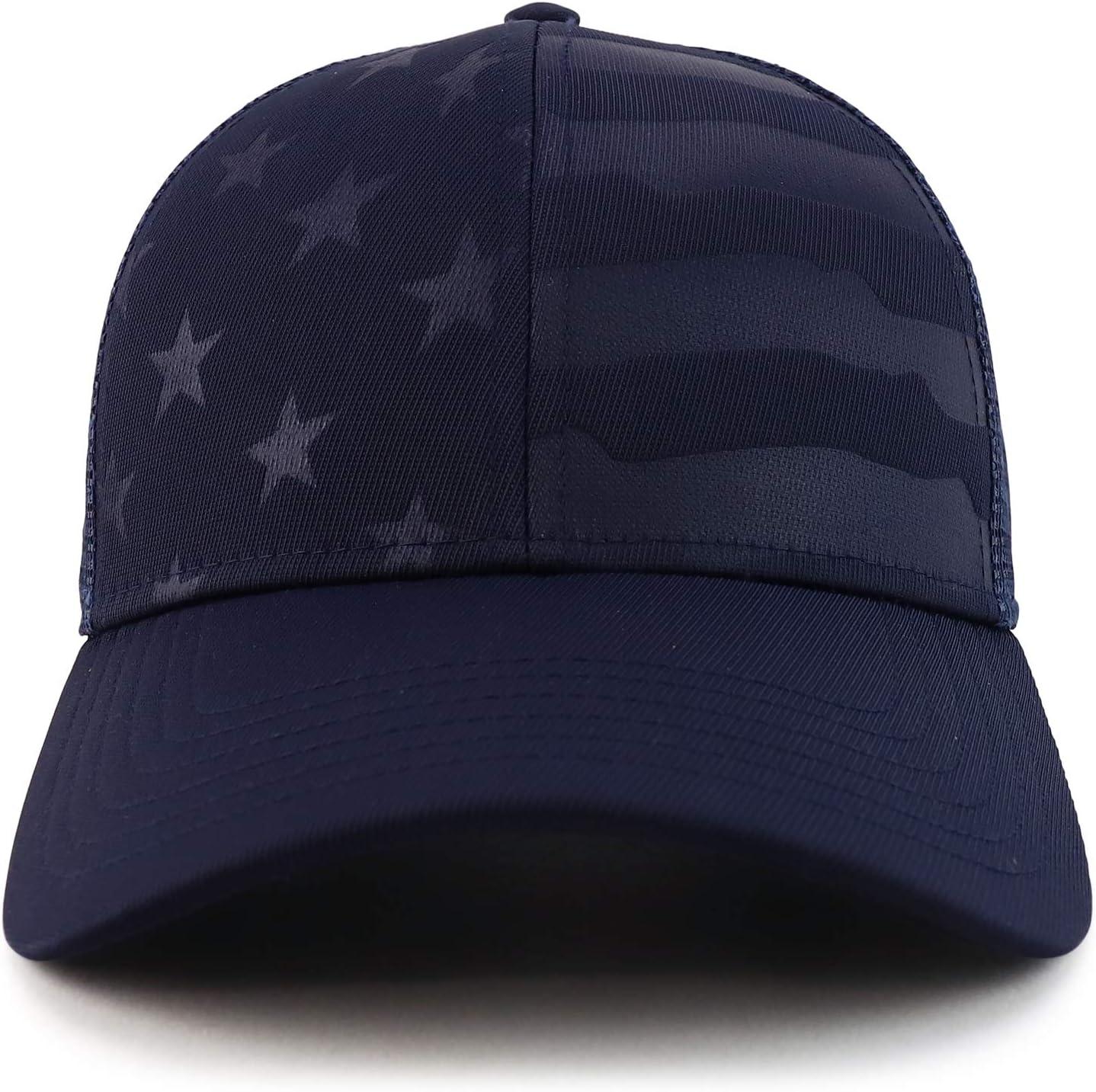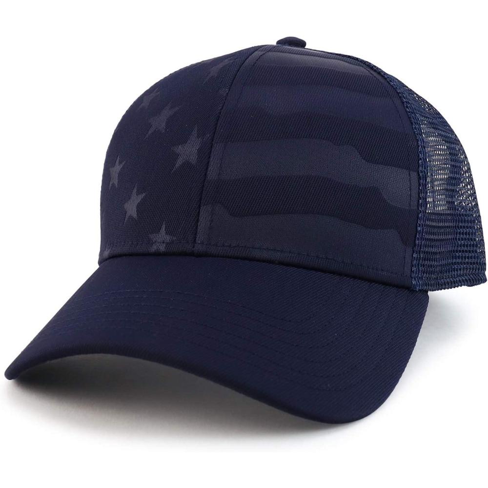 Trendy Apparel Shop Debossed Stars and Striped Trucker Mesh Back Baseball Cap. Polyester/spandex blend; Nylon mesh back. **IMPORTED : Hand wash available. ADJUSTABLE PLASTIC SNAP CLOSURE : One Size Fits Most, Comfortable Everyday Fit. DEBOSSED STARS AND STRIPES : Proud of US – Represent your loyalty, duty, respect, honor, pride. STYLE YOUR WAY : Best cloth decorations for men women on fourth of July and every day!. CIRCUMFERENCE: 56-60cm; Brim: 2.7 inches; Crown: 3 inches.