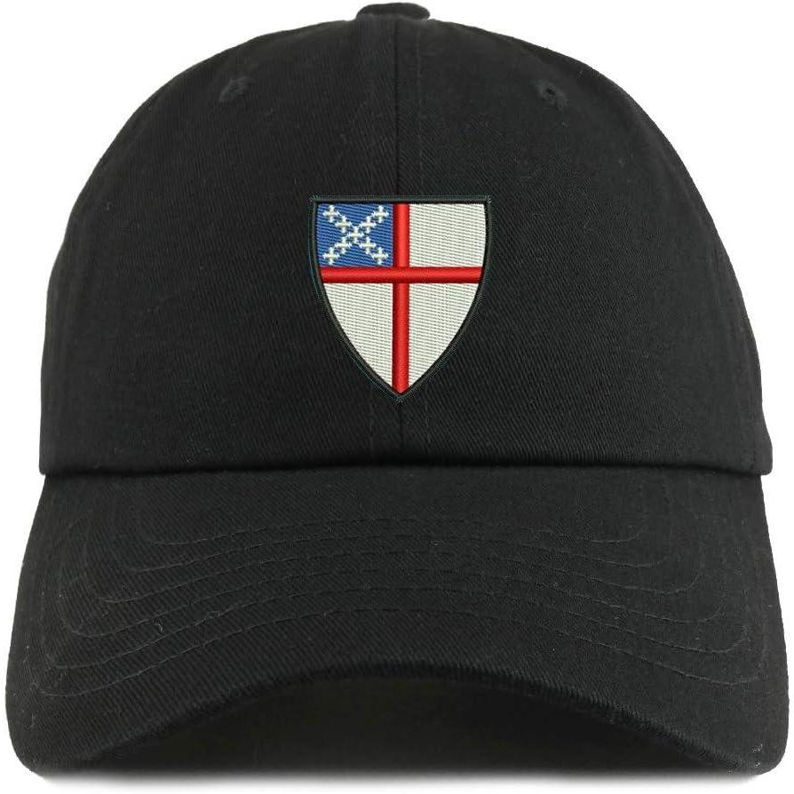 Trendy Apparel Shop Episcopal Shield Solid Adjustable Unstructured Dad Hat. 100% Cotton. Solid cotton baseball cap for everyone. 6 paneled, low profile and unstructured crown. Stiff and pre-curved bill, 1 ventilation hole placed on each panel of crown. Adjustable metal buckle strap closure. One Size Fits Most.