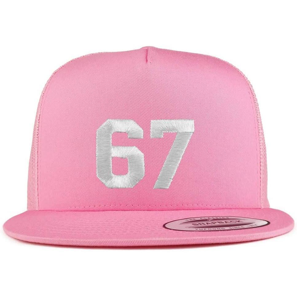 Our Number 67 White Thread Embroidered Flat Bill 5 Panel Trucker Cap – Made of 47% Cotton, 25% Polyester, 28% Nylon. Front constructed crown with 4 mesh back panels. 5 panels, high profile. Stiff and flat bill. Adjustable plastic snap closure. One Size Fits Most.