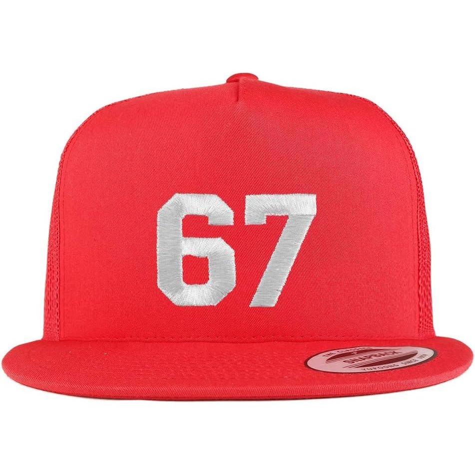 Our Number 67 White Thread Embroidered Flat Bill 5 Panel Trucker Cap – Made of 47% Cotton, 25% Polyester, 28% Nylon. Front constructed crown with 4 mesh back panels. 5 panels, high profile. Stiff and flat bill. Adjustable plastic snap closure. One Size Fits Most.