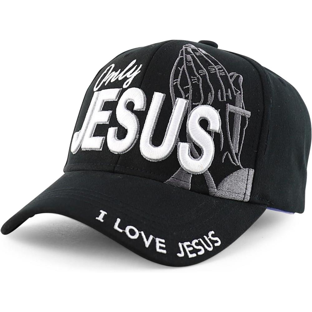 Trendy Apparel Shop Only Jesus Praying Hand Embroidered Christian Ball Cap. 100% Polyester. 3D JESUS with praying hand is embroidered on the front. 6 panels, mid profile, structured crown. Stiff and pre-curved bill, same color under bill, I LOVE JESUS is embroidered on the side of bill. Finished with an adjustable hook and loop closure, I LOVE JESUS is embroidered on the back strap. One size fits most.