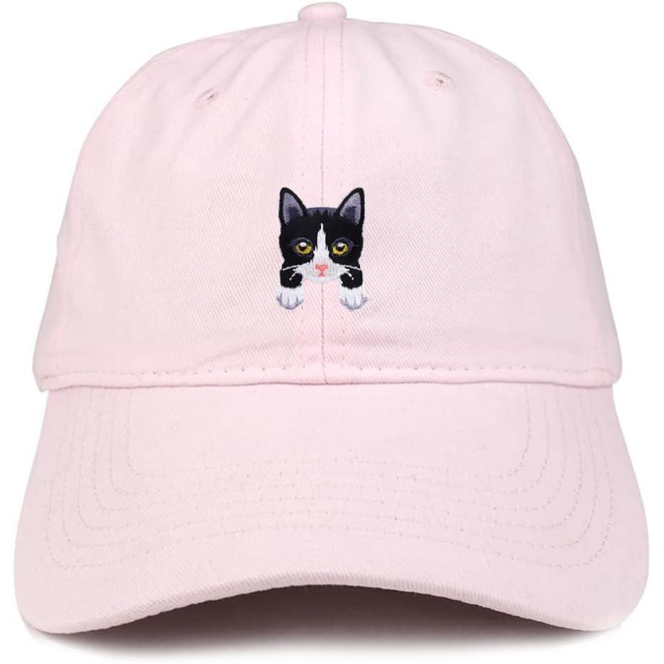 Trendy Apparel Shop Tuxedo Cat Kitten Patch Low Profile Soft Cotton Baseball Cap. 100% Cotton. High Quality Custom Embroidered in USA. 6 panels, low profile, unstructured crown. Dad hat styled baseball Cap. Adjustable Strap Closure. One Size Fits Most .