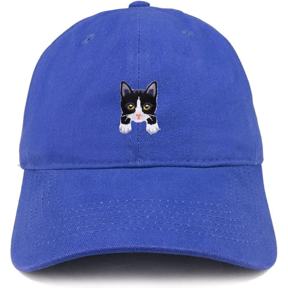 Trendy Apparel Shop Tuxedo Cat Kitten Patch Low Profile Soft Cotton Baseball Cap. 100% Cotton. High Quality Custom Embroidered in USA. 6 panels, low profile, unstructured crown. Dad hat styled baseball Cap. Adjustable Strap Closure. One Size Fits Most .