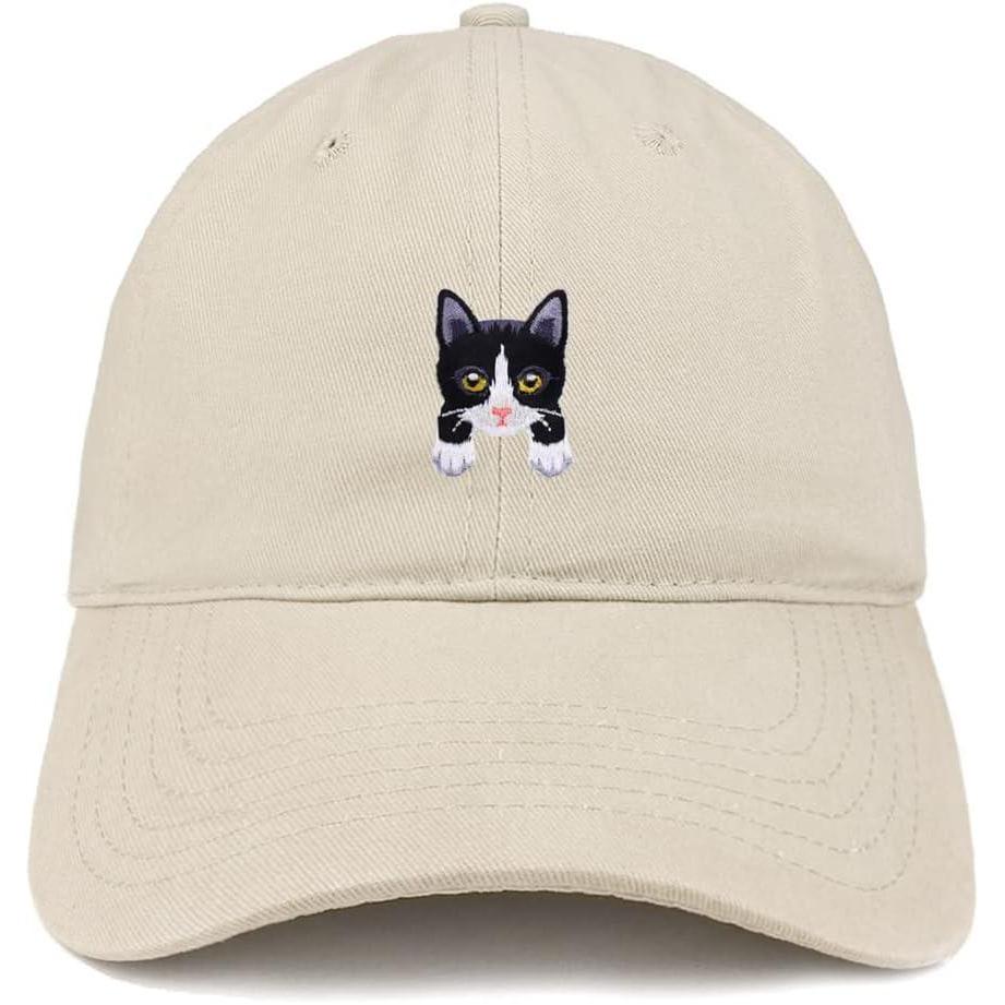 Trendy Apparel Shop Tuxedo Cat Kitten Patch Low Profile Soft Cotton Baseball Cap. 100% Cotton. High Quality Custom Embroidered in USA. 6 panels, low profile, unstructured crown. Dad hat styled baseball Cap. Adjustable Strap Closure. One Size Fits Most .